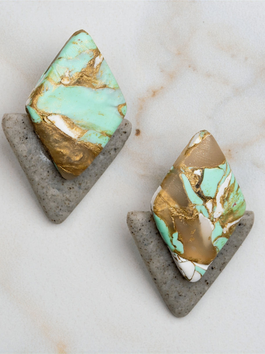 These geometric earings are made of polymer clay designed to look like faux turquoise and granite and made with gold plated earring posts.